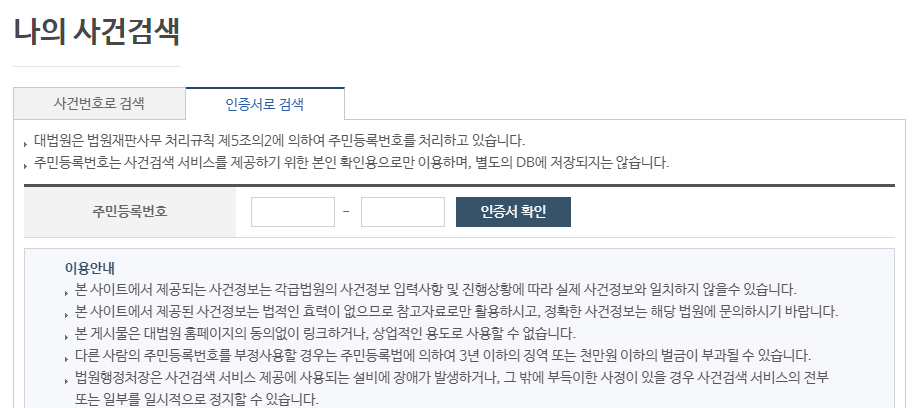 당사자인 경우 공인인증서로 나의사건검색을 확인할 수 있습니다. 위에 사건번호로 검색 옆에 '인증서로 검색'을 클릭하고, 주민번호를 입력한 후 '인증서확인'을 클릭하여 인증서 선택하시면 됩니다.