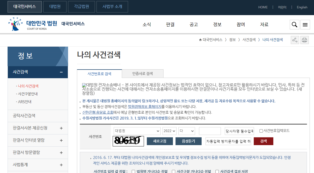 여기까지 사건번호를 알고 있을때 나의 사건검색하는 방법에 대해 설명드렸습니다. 이어 나의 사건번호를 모를때 인증서로 검색하는 방법에 대해서 설명 드리겠습니다.