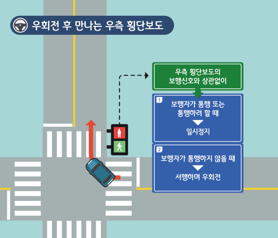 두번째는 차량 신호가 녹색이라 당연히 우회전을 하려는데 바로 이어서 만나는 보행자 신호등이 녹색인 경우입니다. 이때 보행자가 횡단하고 있다면 일시 정지하는 너무 당연한거지만, 요즘 사람이 다 건너고나서도 무조건 보행자 신호등이 빨간불 될때까지 기다려야 한다는 말들이 있습니다. 근데 이거 사실이 아닙니다. 경찰청 보도자료를 보면 보행자나 건너려는 사람 자체가 없다면 서행하면서 우회전이 가능합니다. 그러니까 보행자 보호 취지 자체는 좋지만 교통흐름도 중요한 만큼 좌우를 잘 살피고 사람이 없다면 우회전 해도 된다는 것 꼭 알고 계셨으면 좋겠습니다.