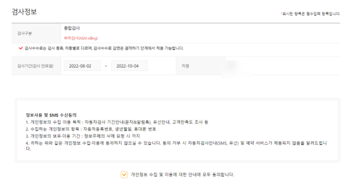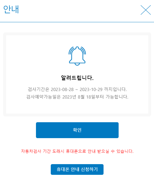 자동차 검사 기간인 차량은 검사예약 진행 안내가 나오고 아직 자동차 검사 기간이 아닌 차량은 검사기간 안내가 나옵니다. 휴대폰 안내 신청하기 해놓으면 검사기간이 다가올때 문자 받을 수 있습니다.
