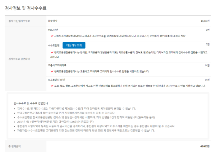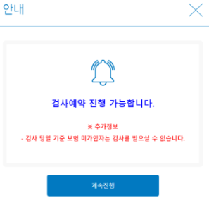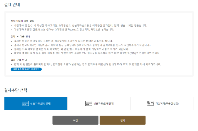 결제수단은 신용카드나 무통장 입금으로 하셔도 됩니다. 결제 완료 되면 문자로 예약사항에 대해 안내가 오니까 예약 날짜에 검사소 방문하시면 됩니다.