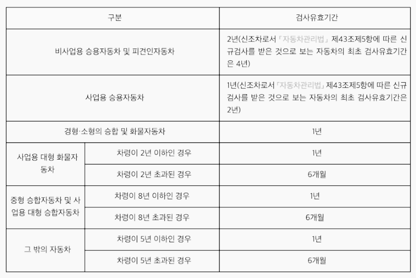 자동차검사는 자동차 종류에 따라 정기검사 기간이 다른데요 신차 출고후 4년이 지나면 최초로 자동차 검사를 받아야하고 이후 보통 일반 승용차는 2년마다 검사를 받으면 됩니다.
