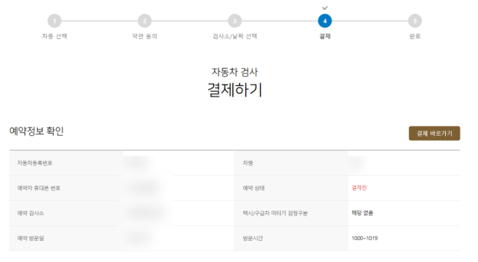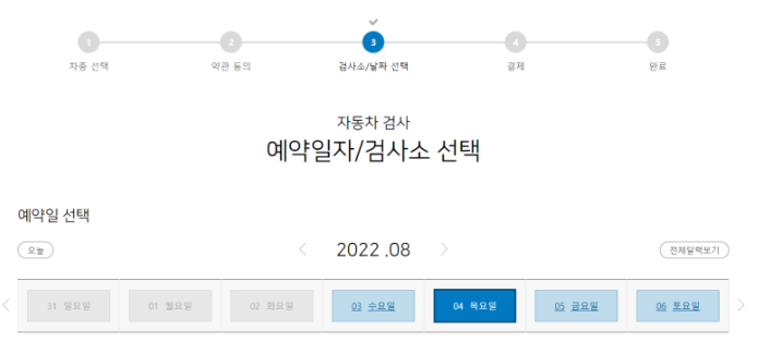 3. [예약정보 입력→ 예약 일자 및 검사소 선택 → 자동차검사 수수료 결제, 예약 완료]