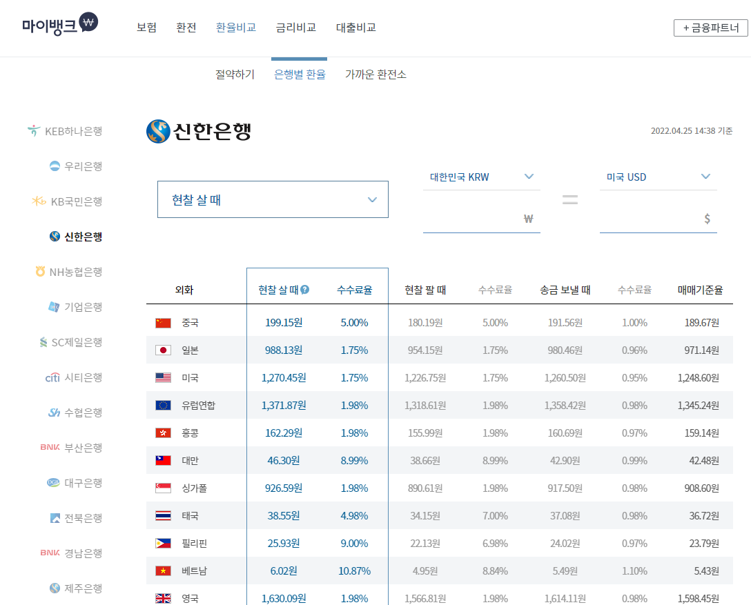 마이뱅크 사이트에서 은행별 환율비교 할 수 있습니다.