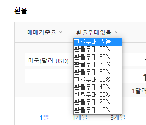 4. 본인에게 적용 가능한 환율 우대율을 설정합니다. (본인의 은행 거래실적에 따라 다른 환율우대율을 가지고 있습니다. 보통 주거래 은행은 환율우대혜택을 많이 주므로 주거래은행부터 살펴 보는 것이 좋습니다.)