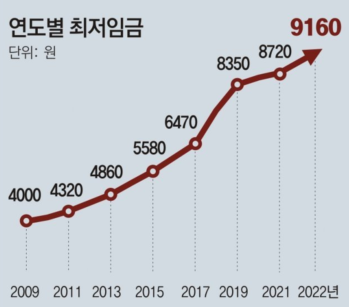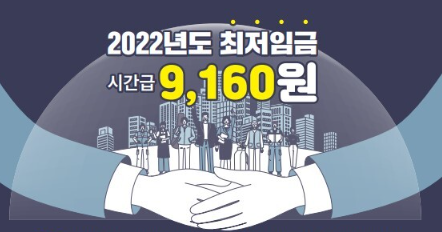 2022년 최저임금은 주 40시간 기준, 한 달으로 계산하면 9만1천960원 오른, 191만4천440원으로 2021년에 비해 440원 인상됐습니다. 2022년 최저임금은 2021년 8,720원보다 5.1% 상승한 9,160원입니다.