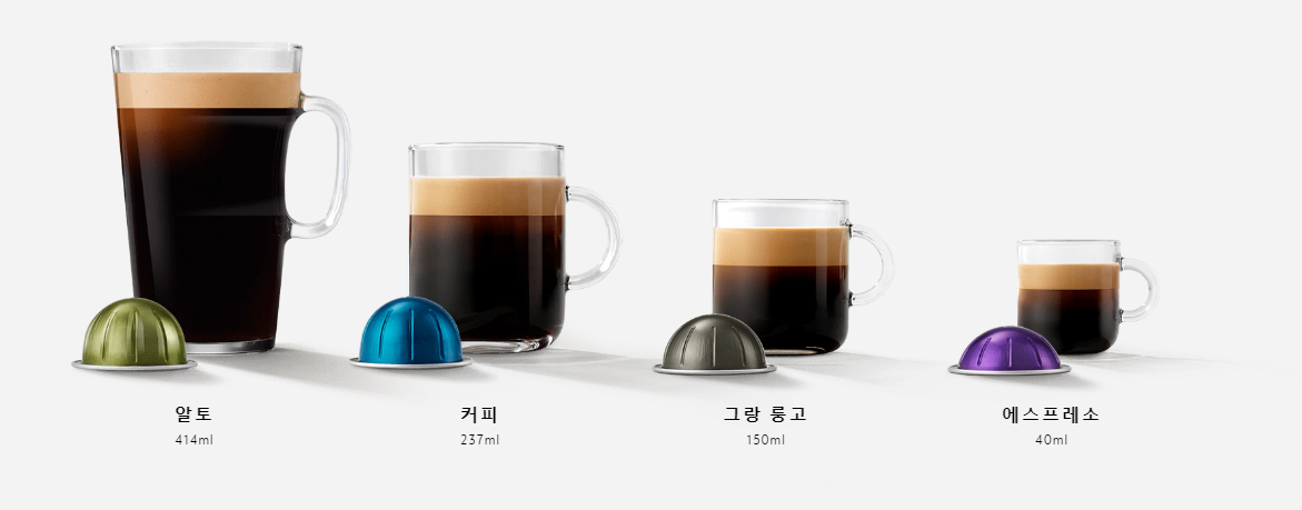 카라프 535 ml > 시그니처 230 ml > 그랑 룽고 150 ml >더블 에스프레소 80 ml > 에스프레소 40 ml