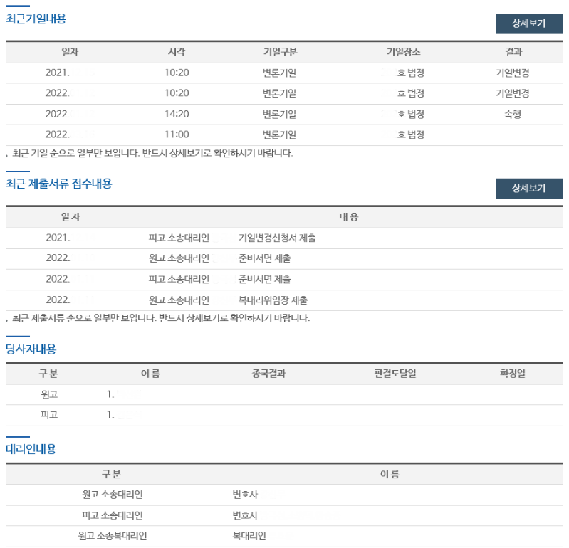 더 자세히 보고 싶으시다면 '상세보기'를 클릭하여 확인해 보시거나, 상단에 보시면 사건진행내용을 눌러서 확인해 보셔도 됩니다. 사건 진행 내용 눌러보면 보다 더 구체적인 진행상황을 확인할 수 있습니다.