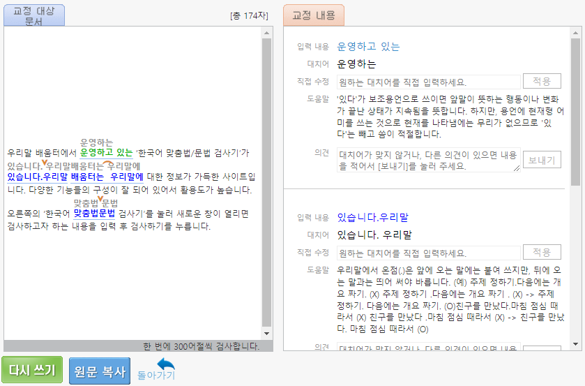 오른쪽 창에 교정내용과 도움말이 자세하게 나옵니다. 교체하고 싶은 문장을 클릭하면 수정된 내용이 반영됩니다. 교정내용에 대하여 사전적 의미를 설명하기도 하며, 교정 이유에 대해서도 자세하게 설명이 나옵니다. 포털사이트 맞춤법 검사기 보다 상세하게 교정 내용을 보고 싶을 때 사용하는것이 좋습니다. 다만 개인용/학생용 사용만 허가하고 상업적 사용은 유료구매로 안내하고 있는점 참고하시기 바랍니다.