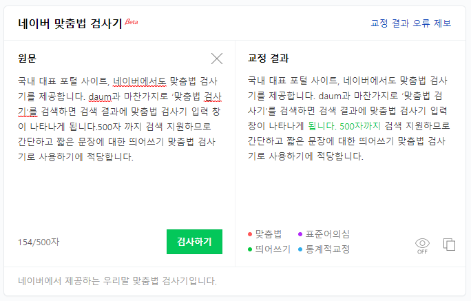 빨간색: 맞춤법, 보라색: 표준어 의심, 초록색: 띄어쓰기, 파란색: 통계적 교정으로 분류되어 나타납니다. 최대 500자까지만 검사가 가능하기 때문에 글자 수가 많으면 500자 단위로 나누어서 검사해야 하는 불편함이 있습니다.