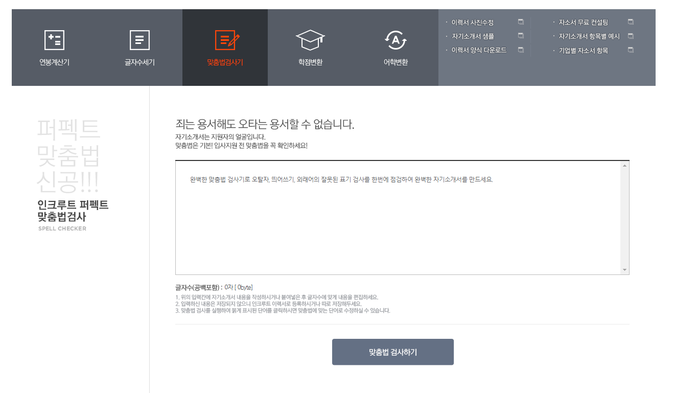 맞춤법검사는 기본! 이력서 및 자기소개서에 오타, 띄어쓰기, 외래어의 잘못된 표기 검사를 한번에! 글자수세기 | 맞춤법검사 | 학점변환 | 어학변환 기능을 인크루트 취업지원프로그램에서 이