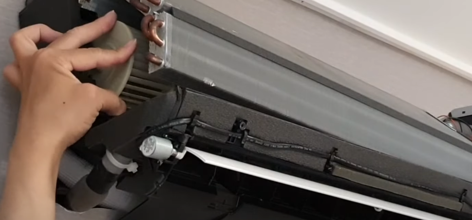 냉각기 세정제와 먼지는 트레이에 고여서 배수 호스로 빠져 나가게 됩니다.