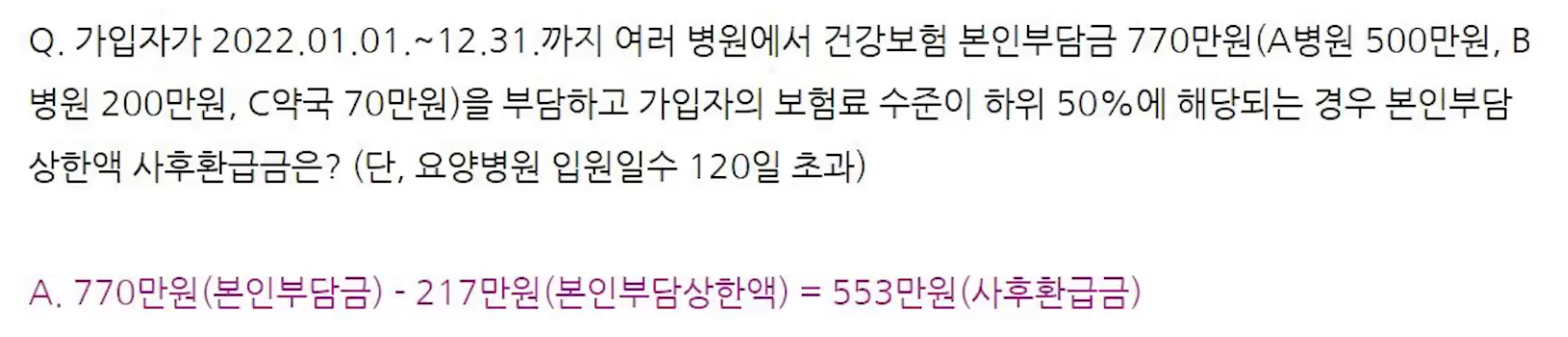 한번 예시를 살펴보겠습니다. 가입자는 여러 병원에서 770만원의 의료 비용을 지불했고, 2분위 보험수준 하위 50%에 해당합니다. 그러니까 위에 표에서 4~5분위에 해당되는 경우입니다. 또 요양병원 입원일 120일을 초과했다고 가정해 보겠습니다.