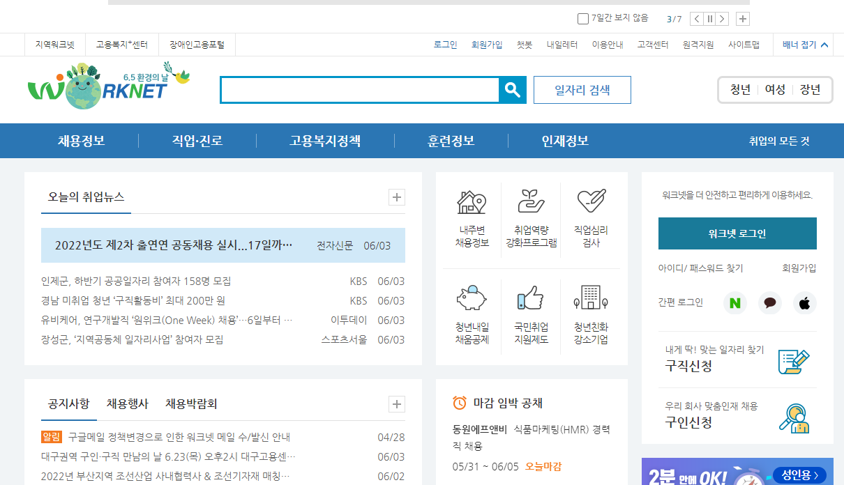 1. 고용보험 홈페이지 또는 모바일 앱에서 본인의 공인인증서로 로그인합니다. 홈페이지 하단을 참고하세요