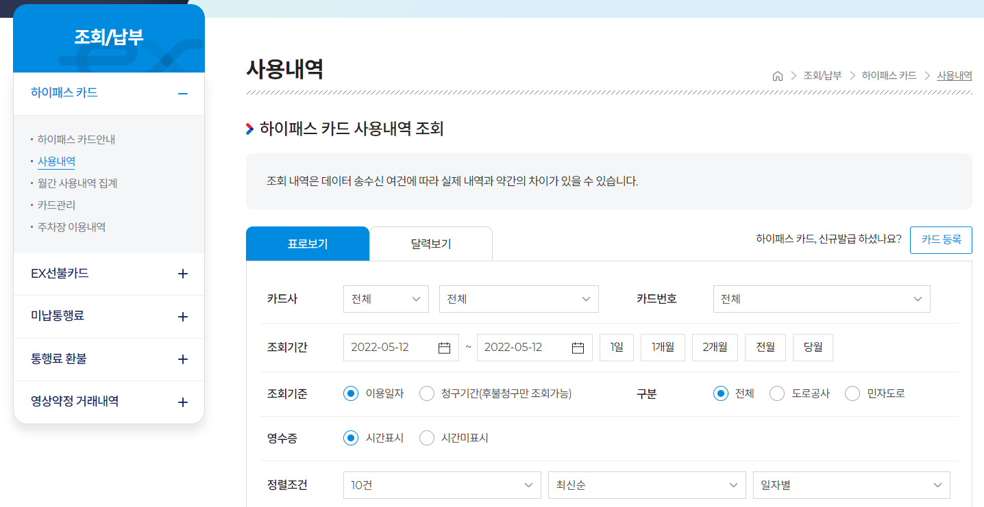 하이패스 사용내역 조회