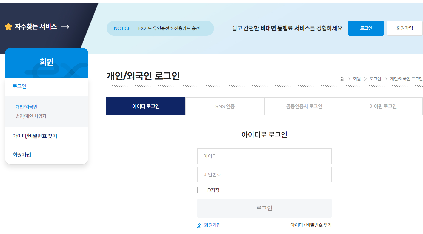 자주찾는 서비스에서 '사용내역 조회'에 들어가면 하이패스 사용내역 볼 수 있는데, 개인정보인지라 먼저 로그인이 필요합니다. 아이디 없으신 분들은 휴대폰이나 sns인증으로 간단히 회원가입부터 해주세요.