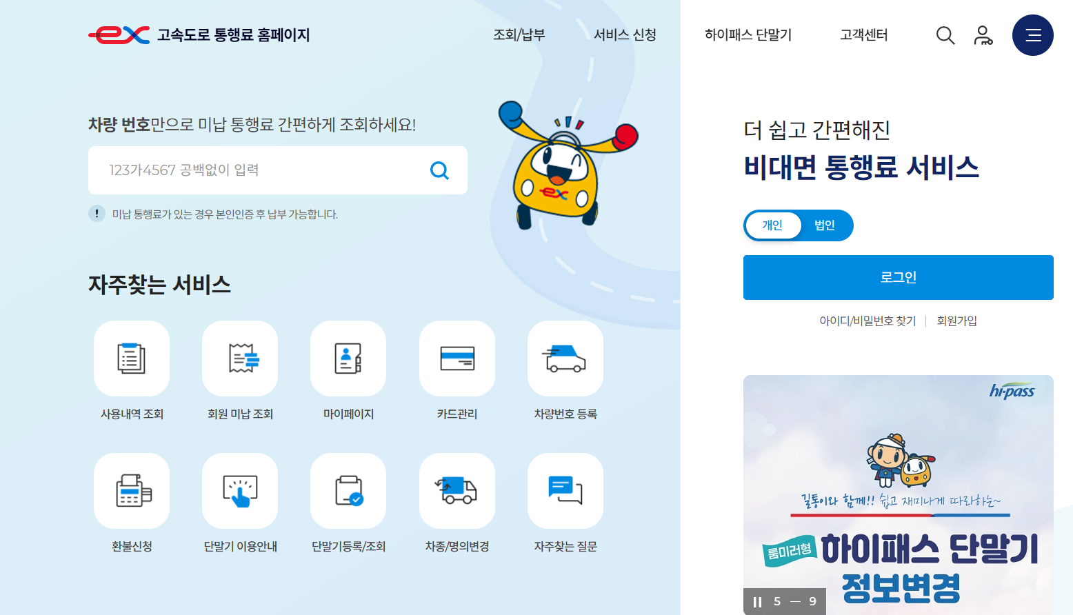고속도로 통행료 사용내역 조회, 미납 통행료 납부, 하이패스 단말기 등록, 하이패스 단말기 명의변경 및 해지, 선후불 카드신청, 통행료 환불
